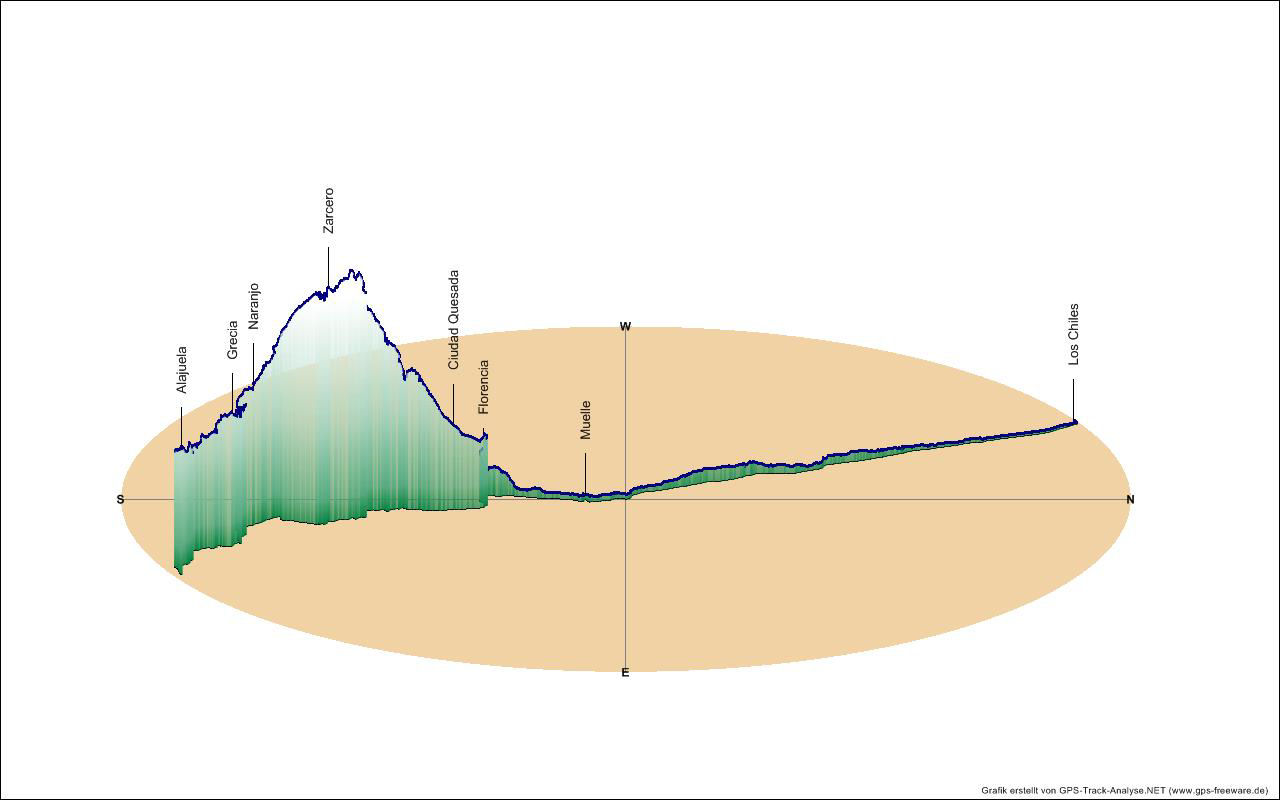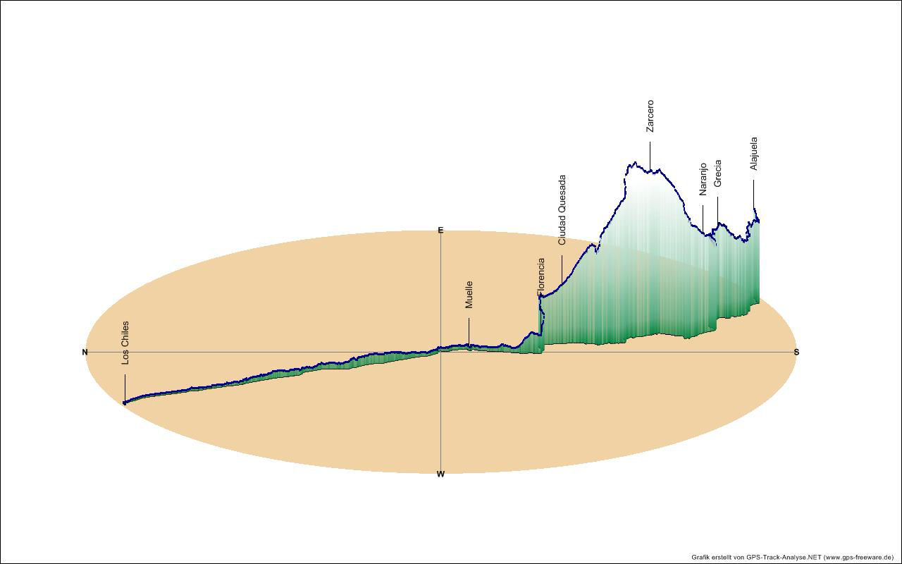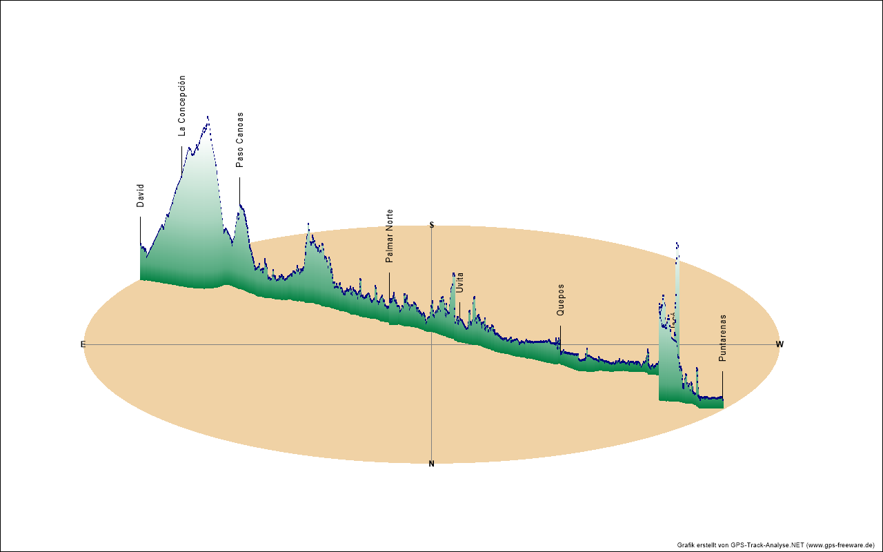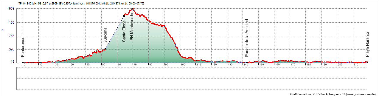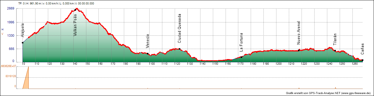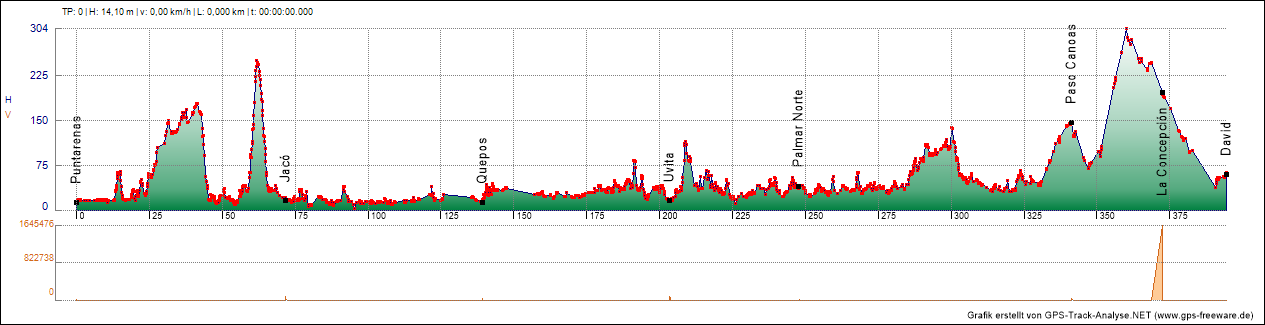 Vorsicht! Die Tracks können trügerisch sein. Man kann nicht erkennen, dass es zwischen Muelle und Los Chiles sowie um den Arenal-See viele Hügel mit kleinen Steigungen um die 20 Meter gibt. Diese können einen ziemlich fertig machen, wenn man sich nicht drauf eingestellt hat. Am Pazifik gibt es solche Überraschungen nicht.