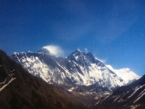 Von Kathmandu aus bin ich mit einem Kleinflugzeug zum Mount Everest geflogen. Während des Flugs hat mich der Kontrast zwischen dem tief blauen Himmel und den schneebedeckten Bergen stark beeindruckt. Dann drehte das Flugzeug unterhalb des Mount Everest eine Schleife. Und so entstand dieses Bild. Der Mount Everest ist der Berg mit der Schnee-Verwehung. Auf den Fußweg dort hoch kann ich so auch gut verzichten. |